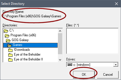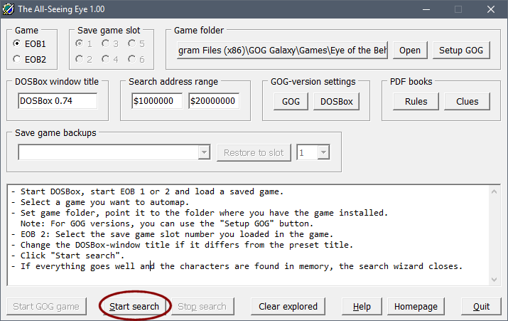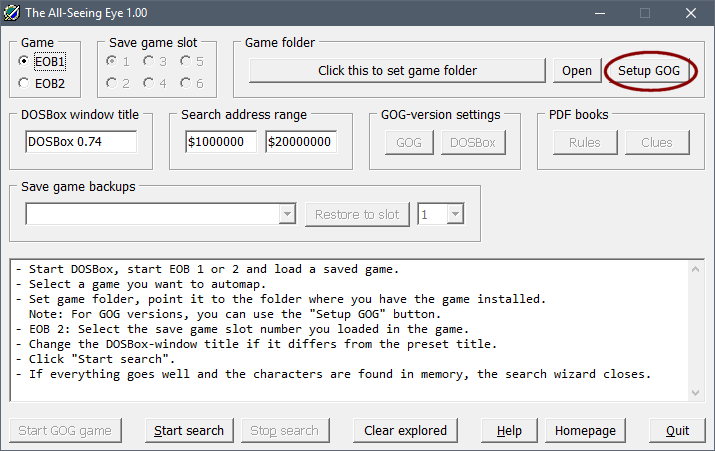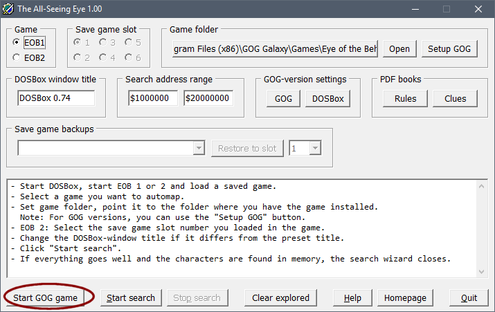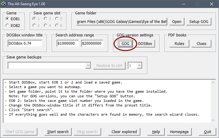 THE ALL-SEEING EYE - TUTORIALThis guide is for the GOG.com versions of the Eye of the Beholder - games. Before using ASE you should first start the game, create a party of characters, begin adventuring and save the game. Extract all files from the ASE.zip archive to a wanted location. Start ASE.exe. Click the "Setup GOG" button. ![]() ASE should detect the default GOG / GOG Galaxy install folder but if not, browse to the folder where your EOB games are installed. Click "Ok". ![]() From the game list, select the game you want to play. Click the "GOG" button from the "GOG-version settings" area. ![]() Uncheck the "Full Screen" checkbox. ![]() From "Advanced Settings" you probably want to adjust the "Scaling Engine" to "normal3x". Save the settings. ![]() Start the game with "Start GOG game" button. ![]() EOB1 has just 1 save slot. In the case of EOB2: load a wanted save slot and select it also from ASE's "Save game slot" area. Click the "Start search" button. ![]() If all goes well, you should see something like this. You are ready to go. ![]() |